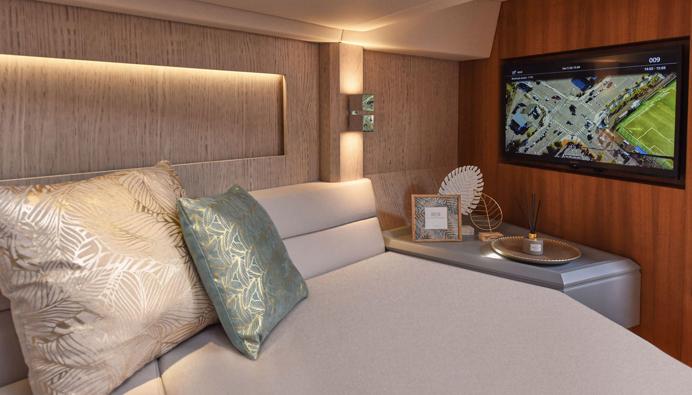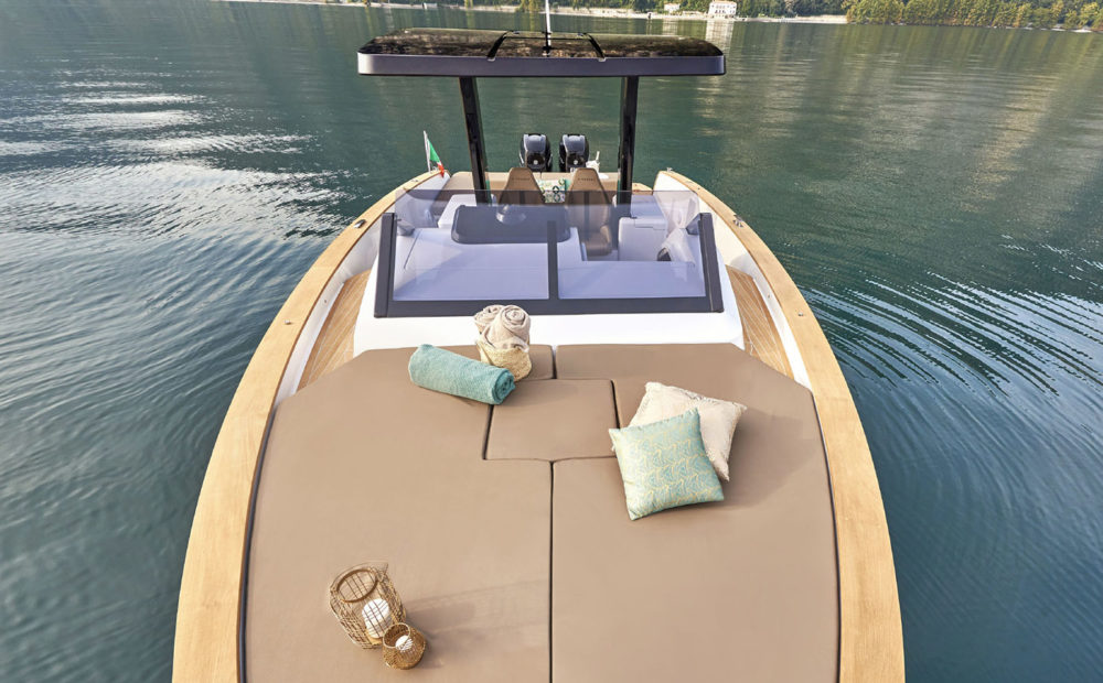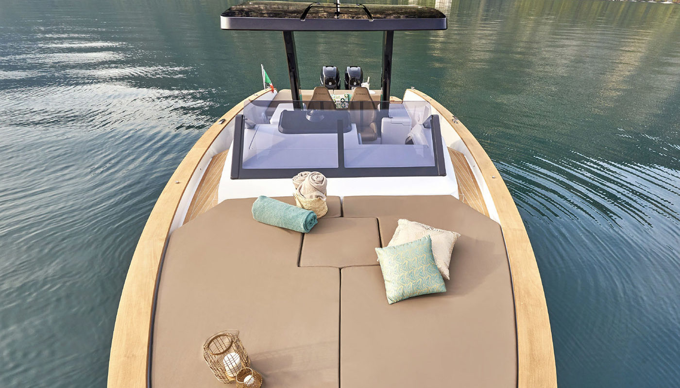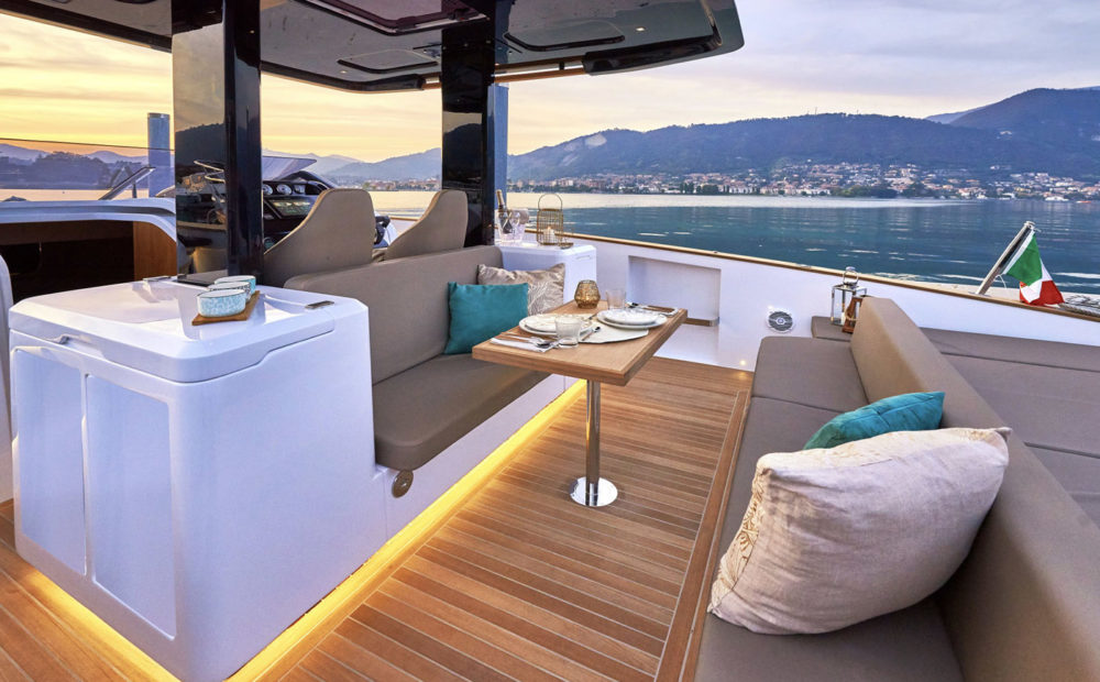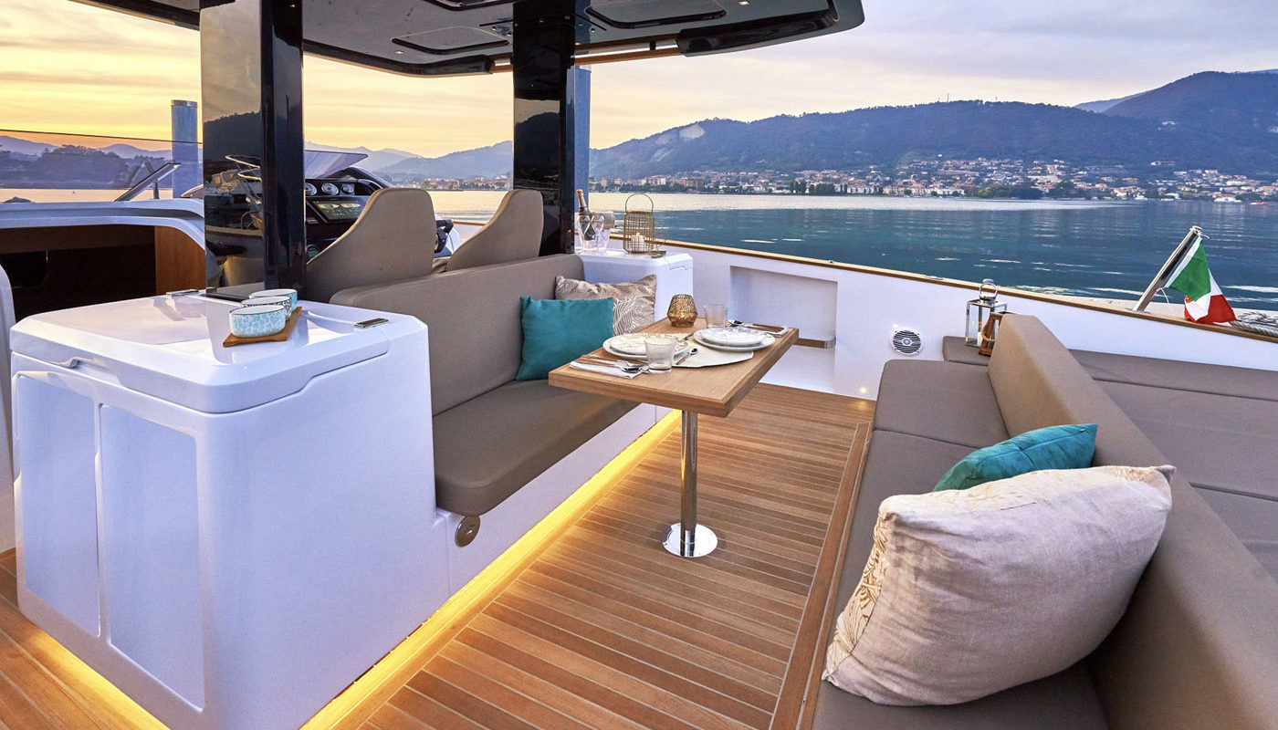 Per gli amanti della poppa libera, le motorizzazioni entro fuoribordo permettono alla grande plancia poppiera di trasformarsi in uno spazioso beach club sull’acqua, equipaggiato di piastre a induzione, tv, ice maker e sound system, in grado di accogliere ben 12 ospiti e condividere il piacere di una giornata in mare aperto.