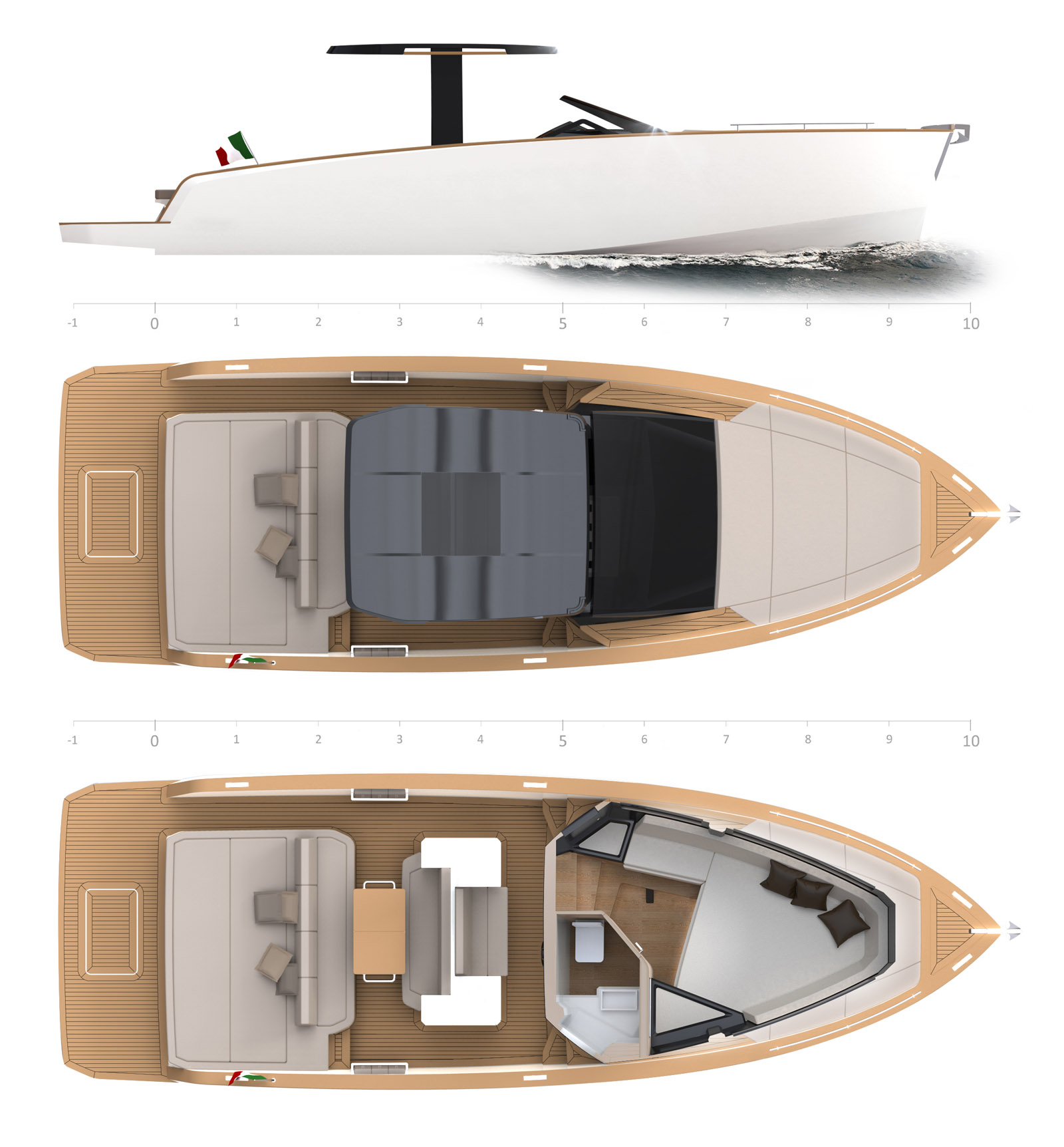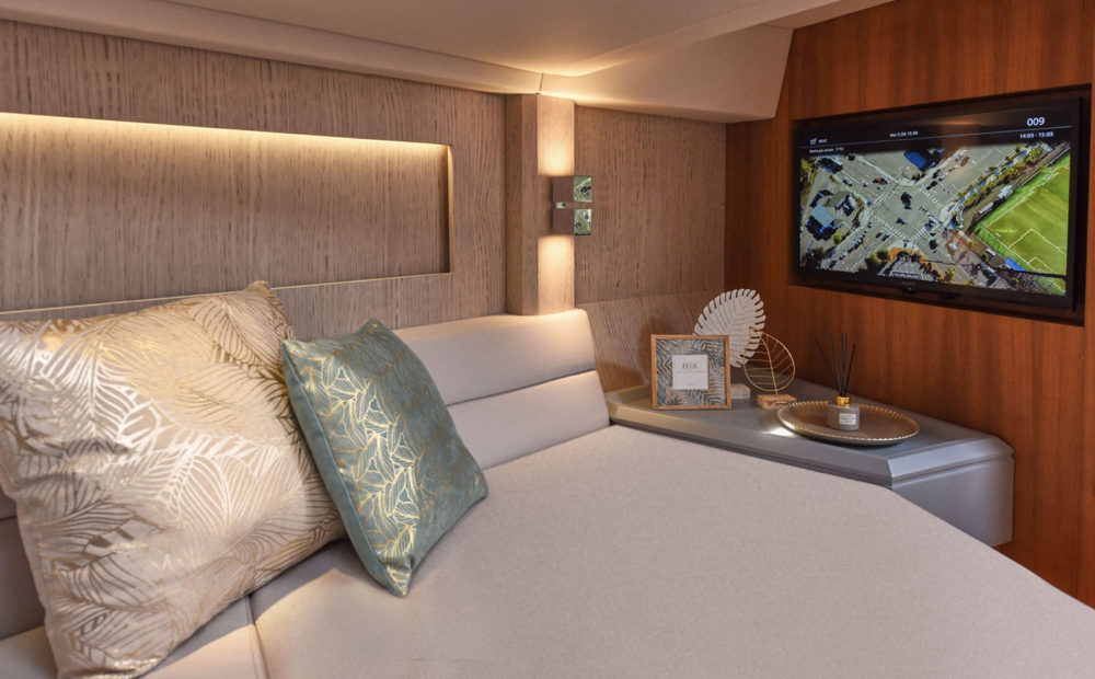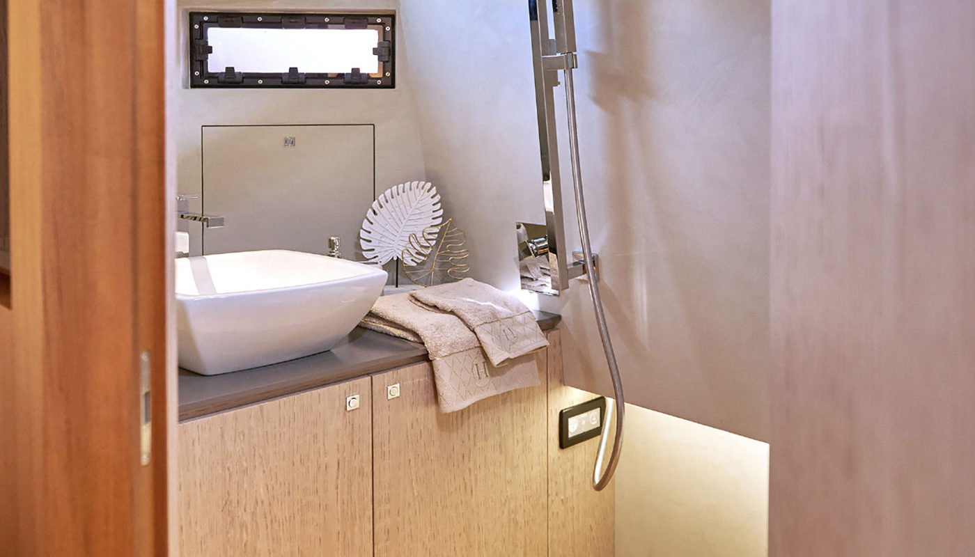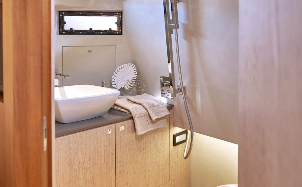 Per gli amanti della poppa libera, le motorizzazioni entro fuoribordo permettono alla grande plancia poppiera di trasformarsi in uno spazioso beach club sull’acqua, equipaggiato di piastre a induzione, tv, ice maker e sound system, in grado di accogliere ben 12 ospiti e condividere il piacere di una giornata in mare aperto.
