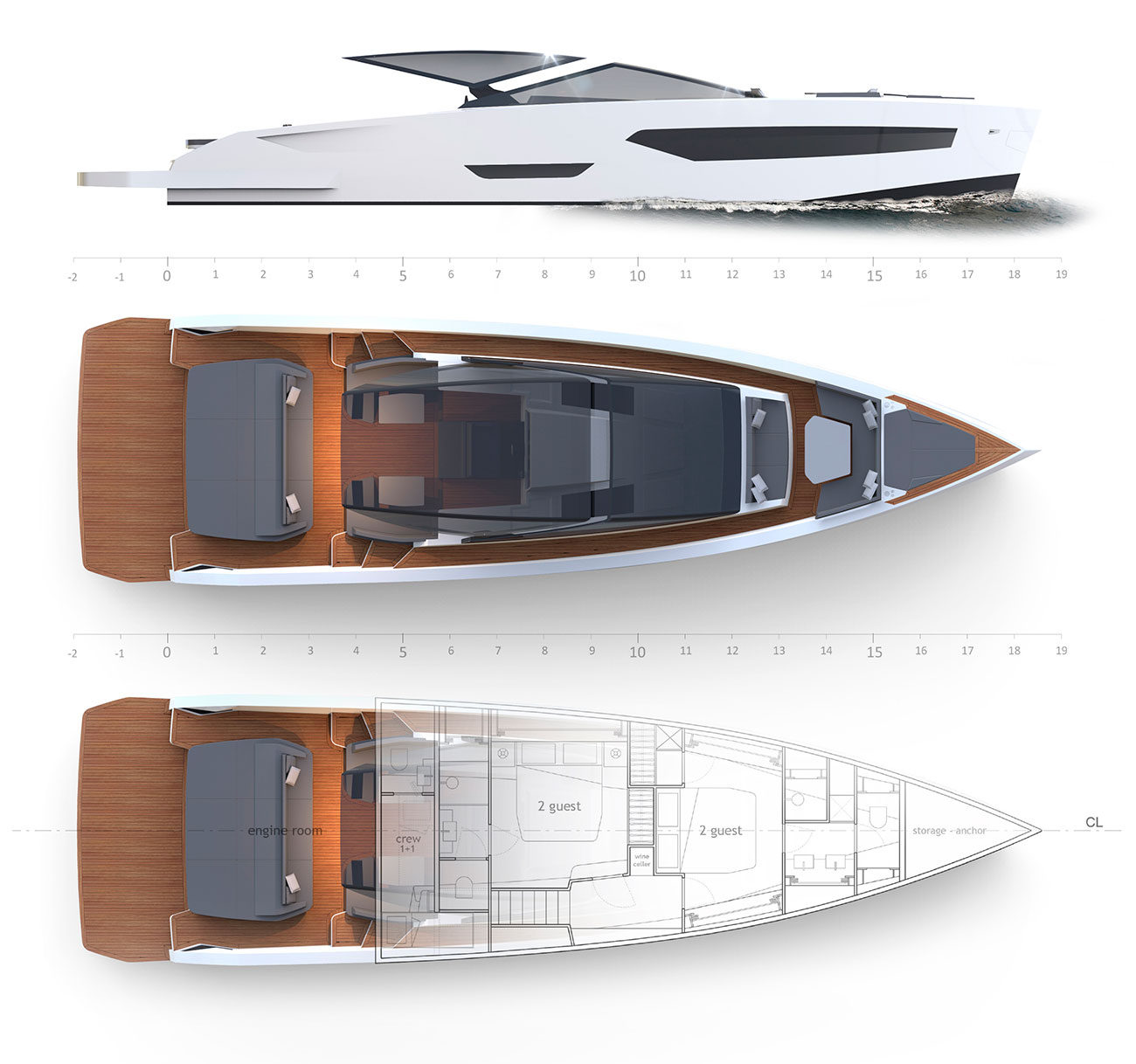 All’interno si trovano due grandi cabine per ospitare fino a 4 ospiti, divise dalla sala macchine con la zona equipaggio a tutto baglio.